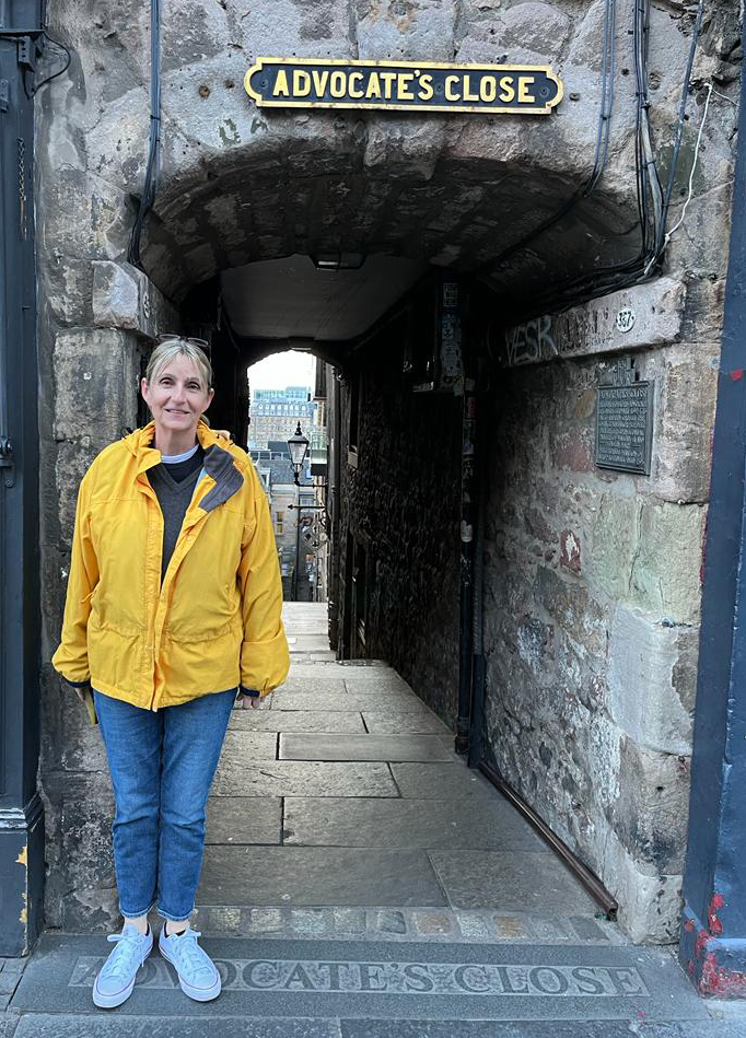 Fritzi stands at the entrance to advocate's close in Edinburgh